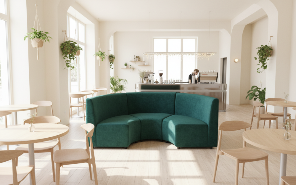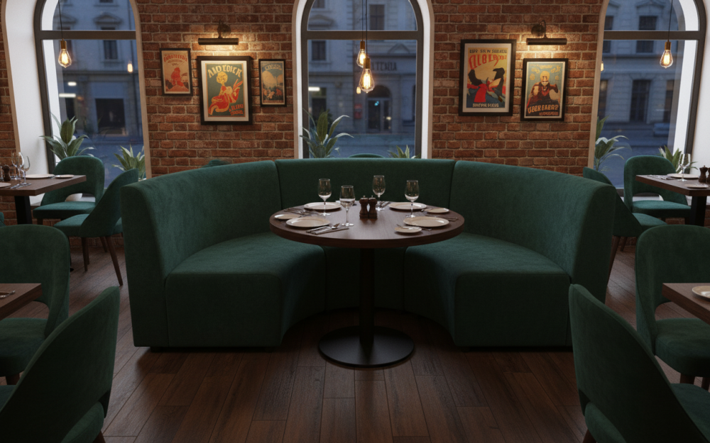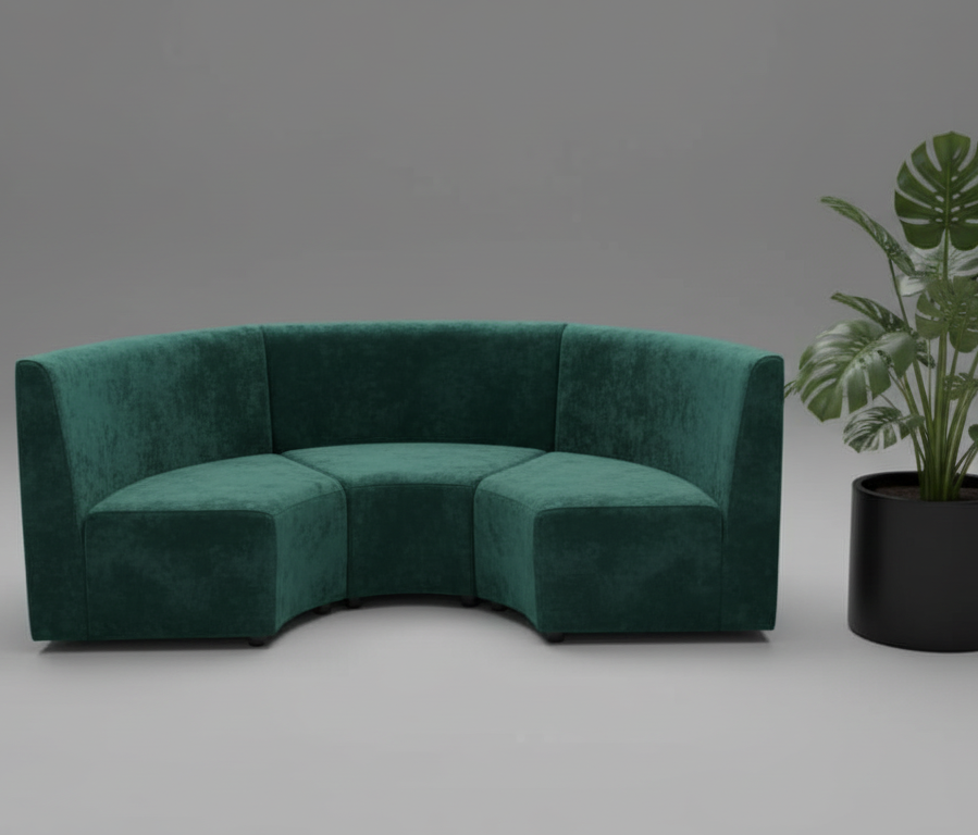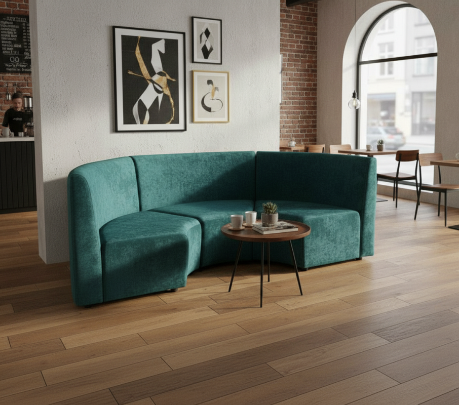 Радиусный диван для кафе и ресторана. Надежный металлокаркас с высоким уровнем ресурса прочности, устойчивый за счет конструктива каркаса и использования самых лучших материалов.